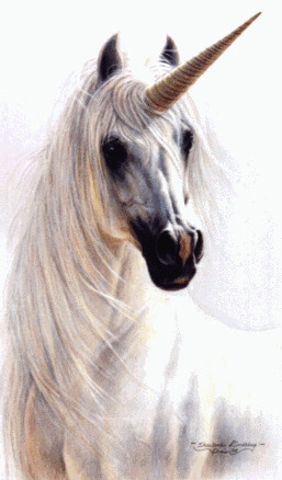 Aussehen: Gleicht einem weißen Pferd mit einem in sich gewundenen Horn auf der Stirn.